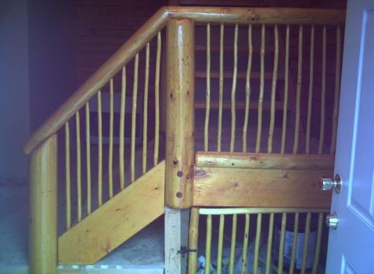 | Perfect for closing off landings- strong, decorative and rustic railings. Made to fit any size or style of stairway or landing. Posts are attached to landing with large dowel pegs, and balusters/spindles are set into the rail at top and bottom. As shown, unfinished- $ 850.00 |