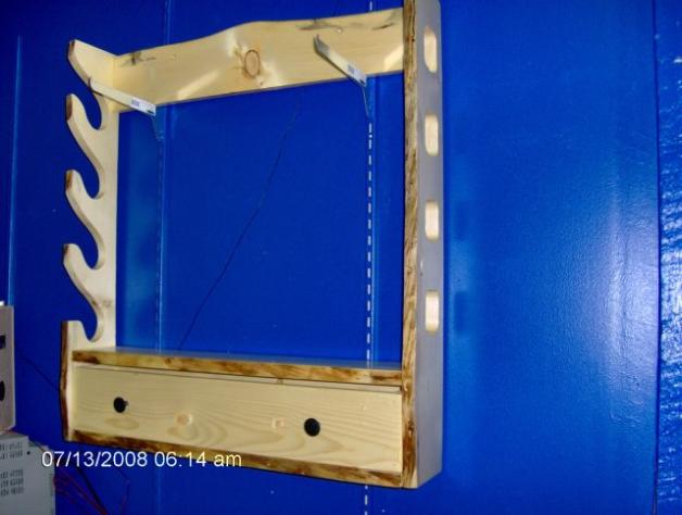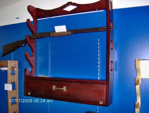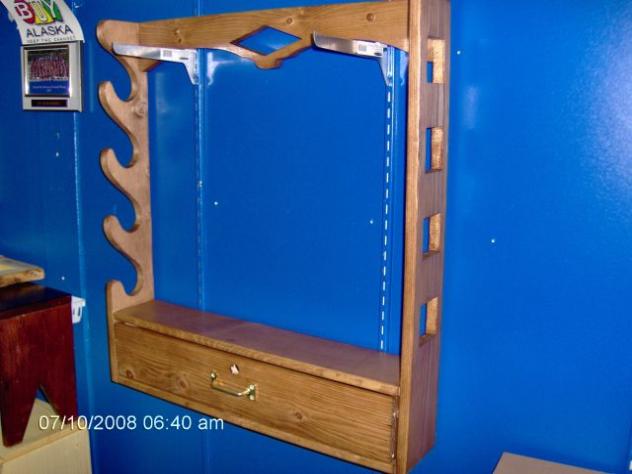 | These 4-gun racks are available in a variety of finishes- from a clear, natural finish (below) to a rich Walnut(above). Check back for photos of racks with other finishes! Also available unfinished, for the do-it-yourselfer. All racks are locking (except the cabin version, below), with either a drawer or drop-down door, and have notches for the barrels to rest in. Finished, with lock hardware-$125.00 Unfinished, with lock hardware-$90.00 Finished, cabin style(no lock)-$115.00 |