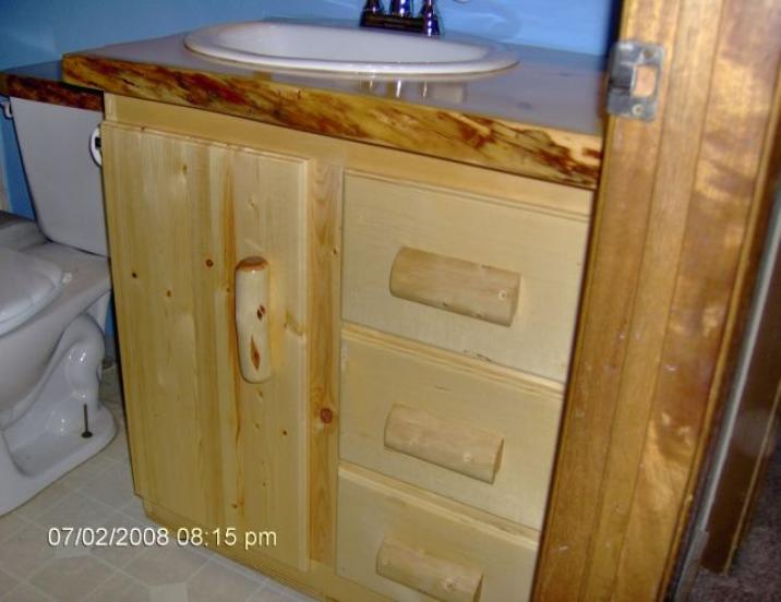 | Custom- made for this bathroom, this cabinet features the trademark 2" slab spruce top, three easy-rolling drawers and a storage cabinet. The drawer handles are spruce log sections and the door handle is a section of diamond willow. This model is 31" wide x 18" deep, with clear varnish. As shown, $ 875.00 (Note the matching natural wood toilet tank cover next to it- also available for only $55.00) |