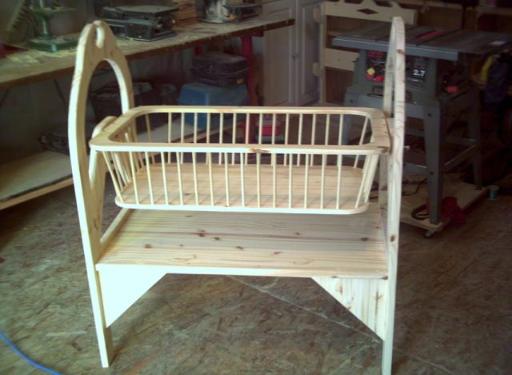 | Have a new family member join you lately? Let him or her cozy up beside your bed in a custom bassinet! Solid, sturdy and beautiful, it will last for years and make a great heirloom for the grand kids! Fits all standard bassinet linens, shelf for diapers, wipes, towels and blankets. Basket swings, with pegs at each end to hold it still while baby sleeps. As shown, $ 650.00 |