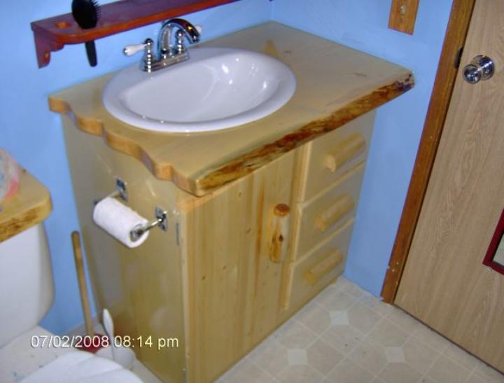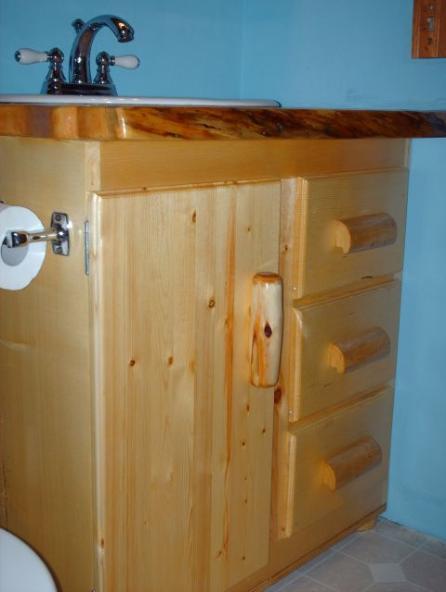 | Custom- made for this bathroom, this cabinet features the trademark 2" slab spruce top, three easy-rolling drawers and a storage cabinet. The drawer handles are spruce log sections and the door handle is a section of diamond willow. This model is 31" wide x 18" deep, with clear varnish. As shown, $ 875.00 (Note the matching natural wood toilet tank cover next to it- also available for only $55.00) |