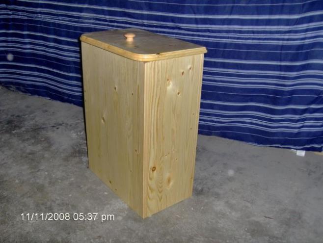 | I decided to build a trash can that was a little more durable than a typical plastic can, not to mention more attractive. It fits a standard 13-gallon tall kitchen garbage bag, and the lid is heavy enough to keep smells in and animals / small children out. The finish color is variable, as is the size, if you have a different application in mind. As shown, they run $75.00- different sizes are different prices, so check with me if you have an idea. |